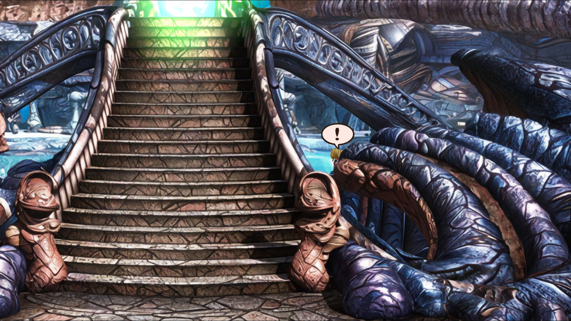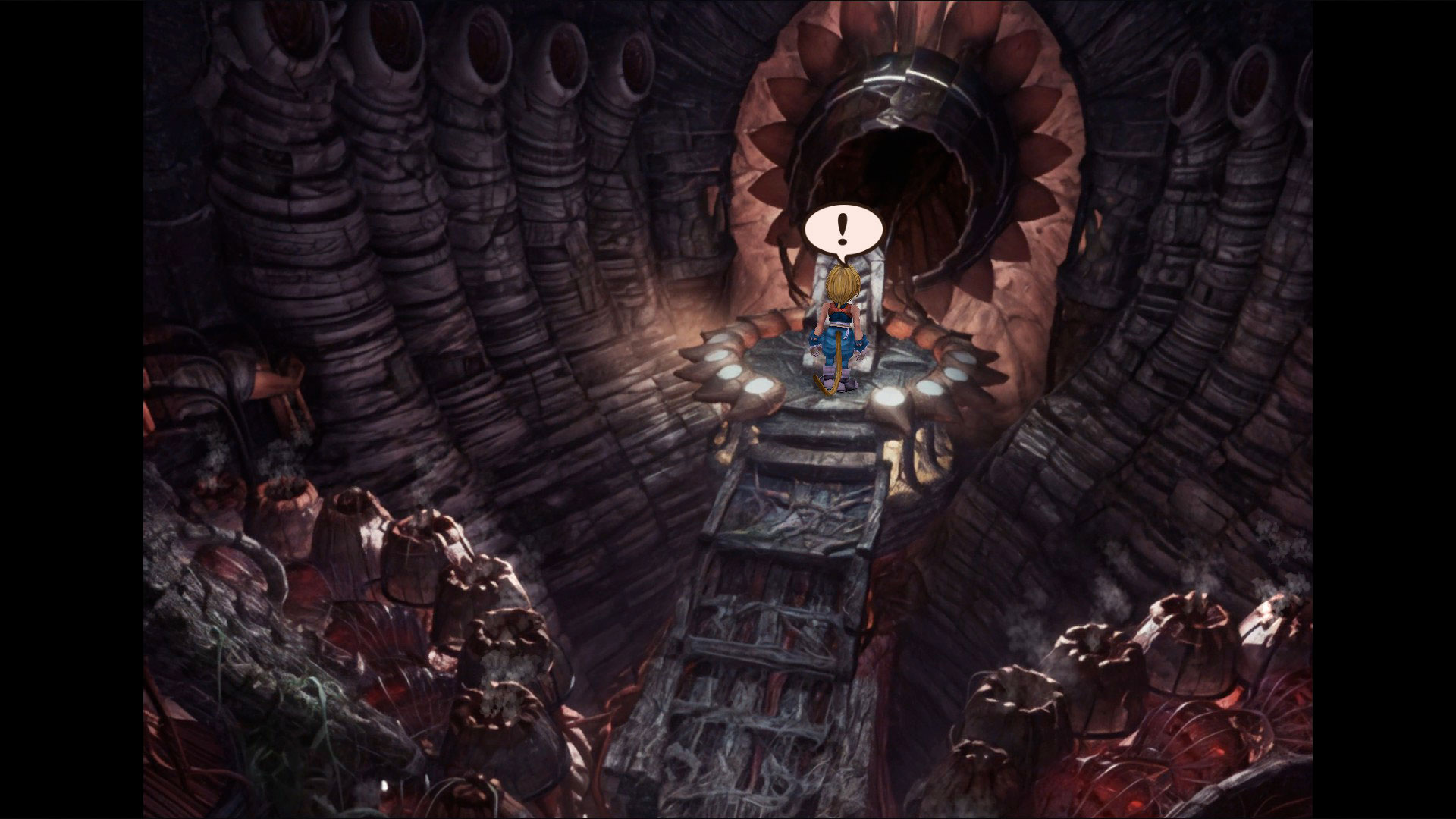 Avec l’Hildegarde, approchez-vous de l’Ile de Lumière, qui se situe au sud-est de Gaza Est (image 76). Après quelques scènes, vous vous retrouverez dans un nouveau monde. Garland vous accueillera en personne. Formez une équipe sérieusement préparée, puis avancez jusqu'à rencontrer une jeune fille ressemblant étrangement à Djidane. Elle s'enfuit à votre vue. Au lieu de la poursuivre, descendez la volée de marches sur la gauche de l’écran pour trouver deux objets, Hypnoronne et Dragonet un peu plus loin (image 77). Remontez et continuez votre route. Prenez le coffre sur la gauche qui contient un Elixir et suivez la jeune fille deux fois pour vous retrouver près d’une espèce de toile. Descendez-la deux fois de suite pour obtenir un Remède. Après cela, remontez d’un étage et sautez le trou sur la gauche. Vous verrez un coffre légèrement caché, qui contient Mithmassue. Descendez alors pour vous retrouver près de la jeune fille. Emparez-vous du coffre (Plastronix) avant de lui parler.