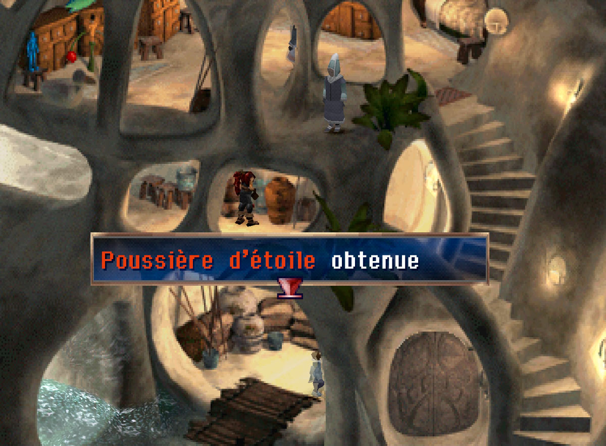 Une discussion se déclenche alors avec le maire. Parlez-lui à nouveau pour passer la nuit chez lui. Après de nombreuses scènes, le lendemain, quittez la maison du maire et dirigez-vous vers la droite avec le canot et entrez dans la maison. Montez sur la mezzanine, puis tirez sur la corde à droite. Allez ensuite à gauche pour glisser et ainsi vous retrouver dans la salle en contrebas. Fouillez le pot en métal ici pour trouver une Poussière d'Étoile. Poussez le levier sur la gauche et afin d’ouvrir la grille. Remontez sur le canot et sortez de la ville en sortant de l’écran par la droite.