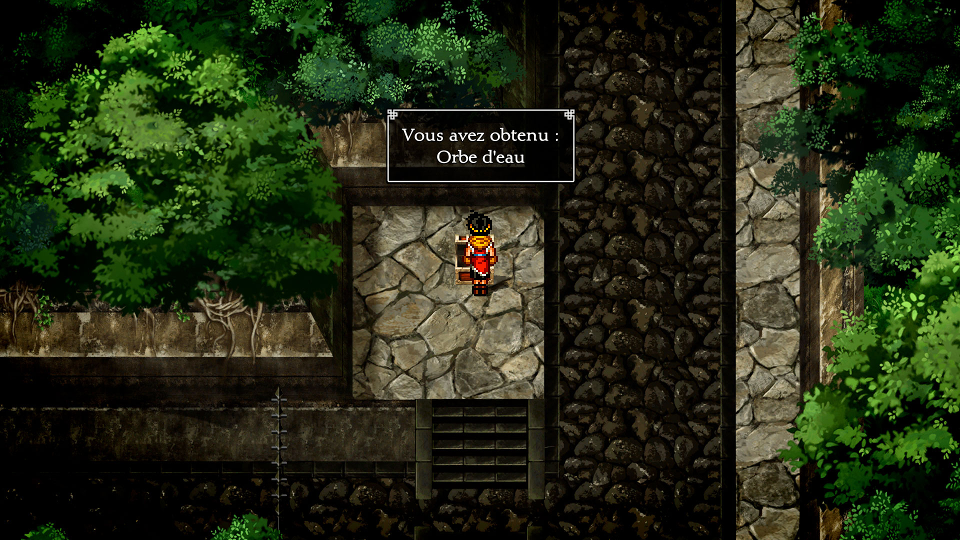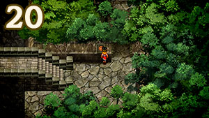 Dans ce lieu, vous allez rencontrer vos premiers ennemis assez puissants et résistants. N’hésitez pas à utiliser l'association avec Jowy, ainsi que les magies de soin de Riou. Sachez qu’il est possible de retourner se reposer gratuitement à l’auberge en cas de besoin. Avancez jusqu’à un premier embranchement. Prenez alors sur la gauche afin de trouver deux premiers trésors : Médicament puissant (3) et Pierre de magie. Revenez à l’intersection et continuez vers le haut de l’écran. Dirigez-vous vers le haut à l’intersection suivante, puis, avant le pont, allez à droite et vers le bas afin de trouver Coup furieux (2) dans un coffre (image 19). Revenez et traversez le pont. Allez alors vers le haut afin d’y trouver des Gantelets. Revenez et passez sous le pont en allant vers le haut de l’écran pour aboutir dans une nouvelle zone. Vous verrez une porte fermée. Traversez le pont sur la gauche, puis poussez la statue sur la droite afin d’ouvrir la porte, ce qui vous permet de récupérer des Épaulettes, et surtout la Plaque ronde. Revenez sur vos pas et placez cette plaque près de la porte close précédente afin de l’ouvrir (image 20). Avancez et vous arriverez sur une petite place avec une statue représentant un serpent à deux têtes : retenez bien cet endroit, car il faudra souvent y revenir. De nombreux chemins sont disponibles, mais pour l'instant, allez sur la gauche pour traverser le pont et obtenir la Plaque triangulaire. Continuez sur la gauche et passez la porte brisée pour obtenir un Orbe de lézard de feu. Retournez à la statue de serpent. Prenez le chemin du haut, puis traversez le nouveau pont situé sur la gauche. Sauvegardez et remarquez la porte fermée par une plaque de forme carrée. Revenez à l’intersection précédente, puis allez sur la droite et suivez le parcours avec différentes marches afin de poser la plaque triangulaire dans son emplacement. Cela aura pour effet de vider l’eau du canal. Revenez sur vos pas et prenez vers le haut à l’intersection pour trouver une Cotte de mailles dans un coffre. Revenez en arrière et descendez dans le canal puis suivez toujours le chemin du bas jusqu’à un coffre contenant un Orbe d’eau (image 21). Revenez vers le haut, puis tournez à gauche à la première occasion afin de trouver la Plaque carrée. Il vous faut à présent retourner au carrefour avec la statue du serpent à deux têtes, donc remontez et sortez du canal sur la droite. Allez en bas jusqu’à la statue. D’ici, allez sur la droite et suivez le parcours jusqu’à trouver une porte fermée. Insérez la plaque carrée pour passer et ainsi prendre l’Orbe de purge magique et le Vieux livre Vol.2. Revenez sur vos pas. Il peut être intéressant de retourner à l’auberge pour vous soigner. A partir de la statue de serpent, allez ensuite vers le haut, puis à gauche afin de sauvegarder. Placez la dernière plaque pour ouvrir la porte. Avancez jusqu’à une stèle qu’Alex examinera. Après un dialogue, avancez jusqu’à une rencontre : BOSS 3 : DOUBLE TÊTE