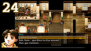 Une scène se déclenche à l’entrée, et vous serez finalement dans la ville après quelques péripéties. Allez à la taverne, tenue par Léona. Vous laisserez Pilika à sa charge pour le moment, puis prenez la direction de la mairie, tout au nord de la ville. Vous y retrouverez Viktor, et vous ferez la connaissance de plusieurs personnages importants comme Anabelle et Jess. Parlez à ce dernier après la scène pour accepter sa mission. Vous obtenez en plus des Uniformes de Highland. Fouillez la bibliothèque près de Jess pour y trouver Livre ??? (image 22), qui n’est autre que le Vieux livre Vol.4. Retournez chez Léona afin de composer votre équipe. Avant de poursuivre, vous pouvez recruter Tuta en lui parlant dans la rue principale de Muse (image 23). Après la scène, retournez chez Huan et parlez-lui pour obtenir la Recette 3. Chez Léona, vous pouvez aussi recruter Anita. Cette dernière est assise à une table dans la taverne : parlez-lui de très nombreuses fois en ressortant de la taverne. A un moment, elle vous demandera des objets comme des Antitoxines ou des Médicaments. Donnez-lui ce qu’elle demande et elle finira par vous rejoindre (image 24). Avant de sortir de Muse, allez tout à l’est de la ville afin de rencontrer Elza et Clive. Vous obtenez Deux paquets de la part d’Elza. Plus loin, vous verrez Clive. Allez à la sortie de la ville et Elza vous octroie le Set de son 1. Avant de poursuivre et si vos finances le permettent, allez améliorer vos armes jusqu’au niveau 4 auprès du forgeron de la ville. Une fois prêt, sortez de Muse et dirigez-vous en direction du nord.