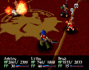 Le combat ressemble beaucoup au précédent que vous avez eu contre lui. Il ne représent pas une grande menace, mais tenez Lilka (ou Tim) sur le qui-vive pour le soin. A noter que Ptomolea peut contre attaquer sur les attaques physiques. Utilisez vos ARM et la transformation d’Ashleu le cas échéant, c’est-à-dire si vous avez le temps d’atteindre 100 FP avec lui.