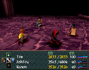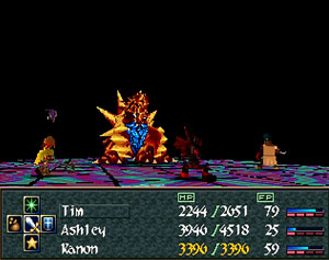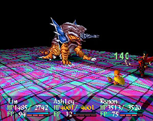 Encore un combat qui pourra rapporter gros avec l’utilisation d’une carte chance. Cet adversaire ne frappe pas très fort, mais peut vous infliger de très nombreuses tares, parmi lesquelles la confusion, notamment. Attaquez normalement avec vos personnages, et en utilisant l’élément feu (ou terre) avec votre magicien (ou magicienne). Le but est surtout que vos personnages puissent entrer en “Condition Green” pour éviter les états anormaux, ce qui vous permettra par la même occasion de pouvoir transformer Ashley. A bien des égards, ce combat est nettement moins compliqué que la plupart des précédents que vous avez pu faire.