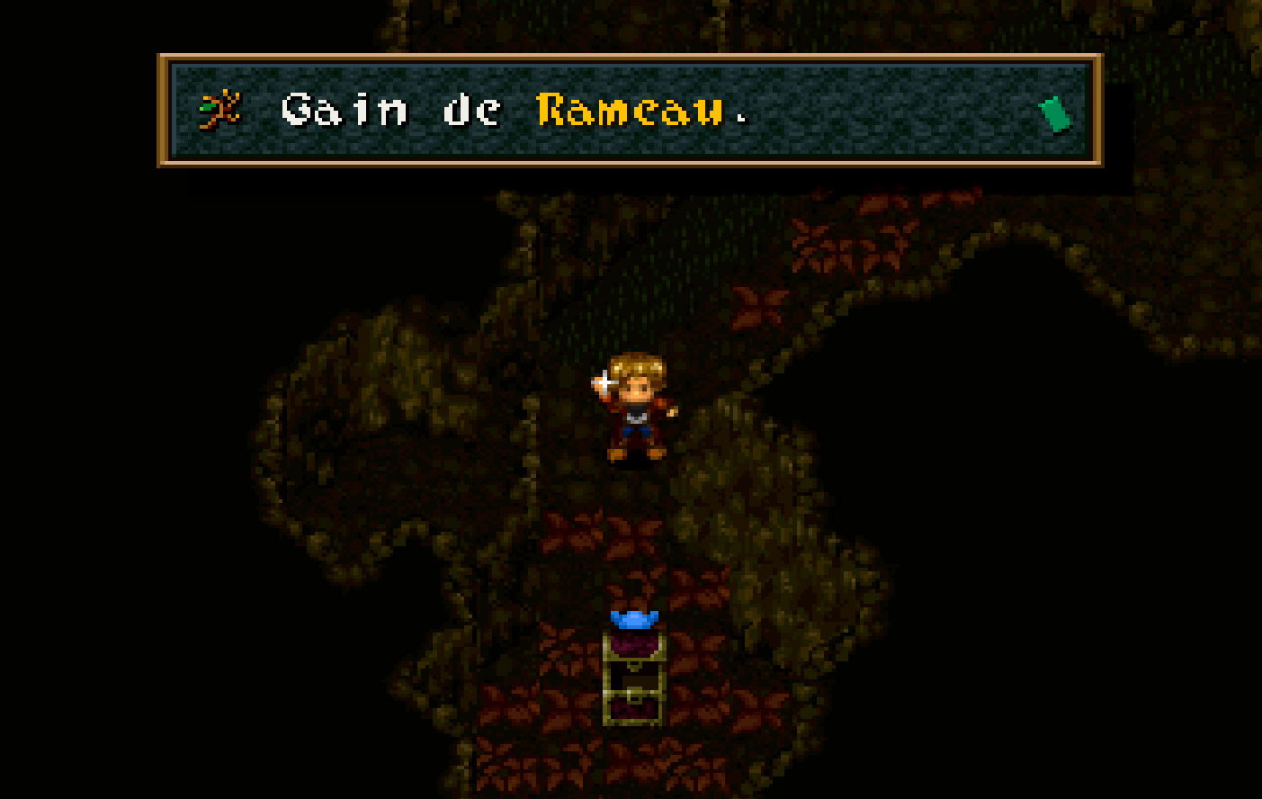 Avancez vers le haut et allumez la lanterne. Suivez le seul chemin possible jusqu’à allumer plusieurs autres lampes. Aidez-vous des Bombes de Rudy pour passer certains passages. A un moment, vous arriverez à une fourche : allez sur la gauche pour y trouver un coffre. Utilisez Hanpan pour ne pas vous brûler et ainsi récupérer Rameau. Revenez et allez à droite et brisez les rochers sur la gauche pour atteindre une lanterne. Ouvrez le coffre caché près d’ici pour trouver un Port’emblème. Sortez par le bas. Avant de sortir du donjon, brisez le mur à l’aide d’une Bombe pour obtenir la Carte Magi. Sortez pour atteindre une nouvelle partie de la carte du monde. Allez au sud jusqu’à la prochaine ville.