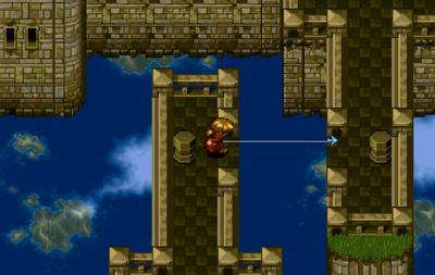 Allez vers le haut pour aboutir dans une nouvelle salle. Allez à droite afin de trouver une Carte Chance. Puis, allez à gauche et engagez-vous dans la rivière de sable. Emparez-vous du coffre sur la gauche (Pom’Robuste), puis suivez le chemin à droite. Sauvegardez. Continuez au sud, puis engagez-vous dans la rivière de sable. Allumez les torches près de la stèle afin de découvrir une nouvelle technique pour Jack : Lame Cura. Refaites tout le chemin jusqu’au point de sauvegarde, puis continuez au sud en ignorant la rivière de sable. Descendez les escaliers (n’allez pas dans la rivière de sable) et suivez le chemin jusqu’à un dernier coffre contenant une Pom’Forte. Descendez les escaliers puis sortez au sud.