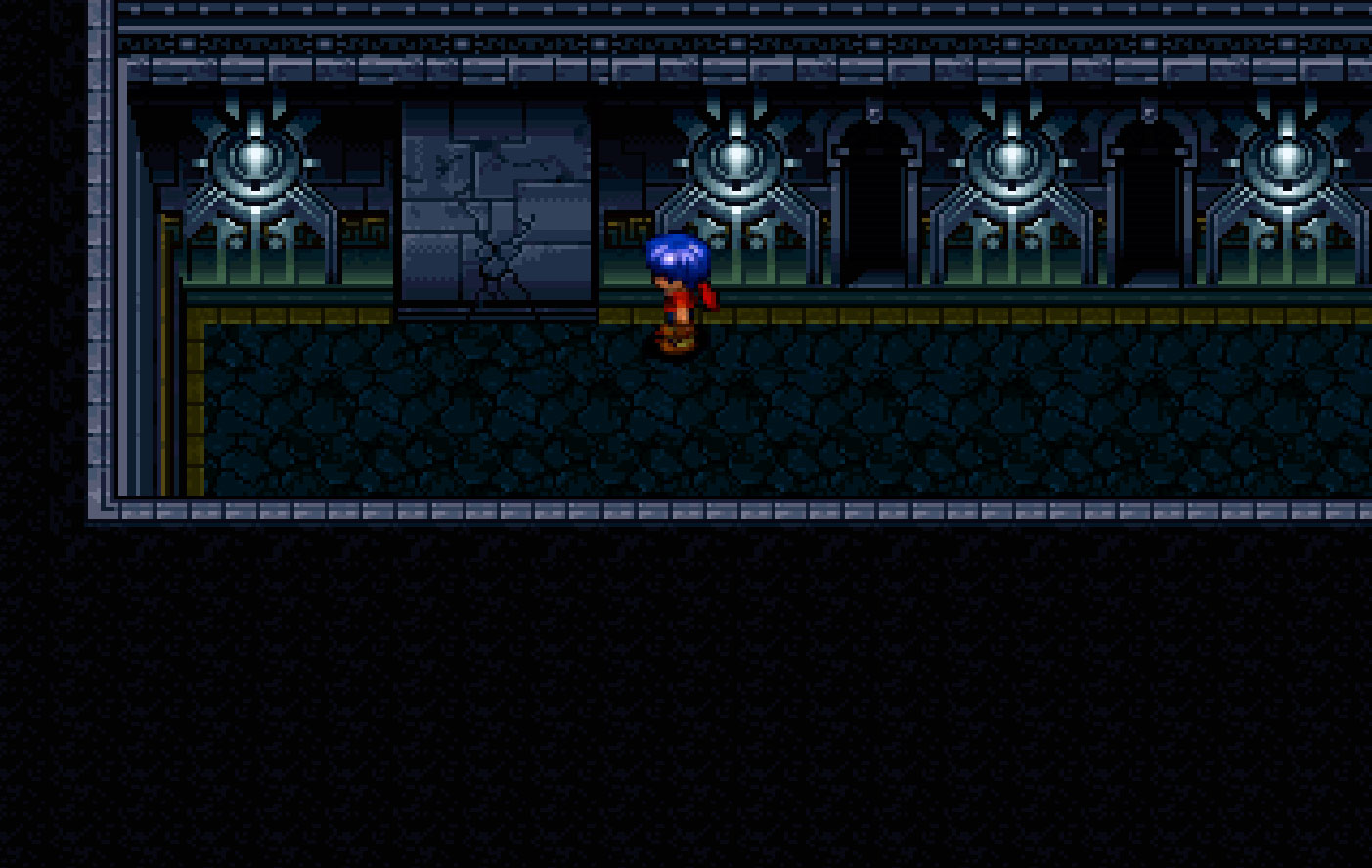 Avancez et passez l’ouverture en haut à la première occasion afin de trouver un coffre contenant un Ecu de métal. Revenez sur vos pas et continuez à gauche. Montez les marches et prenez le coffre (Ambroisie). Placez une Bombe avec Rudy près du globe sur la droite pour ouvrir la porte et continuer. Vous aboutirez dans une zone sombre. Traversez simplement le pont pour retourner dans la tour. Placez des Bombes sur les globes pour ouvrir la porte, et continuez sur le chemin. Si vous n’êtes pas assez rapide, vous serez coincé : utilisez la Montre de Cecilia à ce moment là et recommencez. Suivez le chemin jusqu’à une salle munie de nombreux leviers.