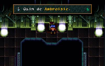 Revenez dans le couloir, et allez tout à gauche pour descendre des marches. Dans la nouvelle pièce, vous trouverez deux coffres contenant 2 Nectars. En haut de cette salle, vous avez trois piédestals. Insérez chacun des pièces de Malduke pour ouvrir la porte. Avancez (2 magi-Carot’) et continuez sur le chemin. Vous arriverez dans une salle avec un projecteur. Allez vers le haut pour prendre Ambroisie dans le coffre, puis laissez-vous prendre par le projecteur.