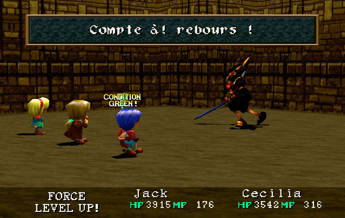 Pour combattre cet ennemi, vous devez déjà avoir vaincu les quatre combats de l’Arène antique. Ensuite, vous devez disposer du CrocSabre, une épée que vous trouvez après avoir combattu Boomerang et Lucéide à Ka Dingel. En ressortant du lieu, vous trouverez cet objet. Ensuite, rendez-vous à l’Arène antique et commencez un tournoi : Boomerang apparaît pour vous affronter. Lancez tout de suite Frein avec Cecilia (2 fois est nécessaire), puis Hi-Shield pour réduire la portée des attaques de Boomerang. Si vous n’avez pas de chance, Boomerang pourra décimer votre équipe en peu de temps avec ses attaques, notamment Boomerang fantôme qui fait très mal. Utilisez un Ambroisie avec Jack pour vous soigner en urgence. Augmentez l’attaque de Jack dès que possible également, profitez par exemple d’utiliser la Formule Double de Cecilia pour cela. Concernant vos attaques, attendez d’avoir la Force 4 de Rudy pour lancer sa meilleure ARM sur Boomerang. Avec Jack, Croc Magnum reste sa meilleure attaque, sauf si ses HP sont au max, dans ce cas utilisez Atout. Boomerang possède un bonne défense donc le combat sera long. Boomerang laisse la Lame divine à la fin du combat, la meilleure arme de Rudy.