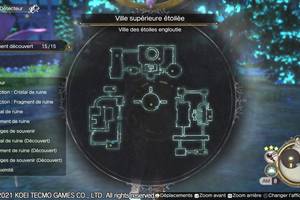 Ville inférieure submergée (Ville des étoiles engloutie)Avancez pour une scène. De nouveaux matériaux sont à prendre : arbre fossile (hache sur bûche), fragment d'étoile (hache sur cristaux jaunes), aqua d'éther (vase), mouche lanterne (filet à insecte sur herbe flambeau), magnearmure (petit tas de pierre). Ouvrez votre journal d’exploration pour voir la liste de recherche. Combattez les ennemis peau de requin (requin enfoui dans le sol), orchis diabolique (vouivre noire) pour compléter deux entrées. Pour les fragments d’étoile, il faut utiliser la hache sur les gros cristaux jaunes (il vous en faut trois). Montez sur le lierre à l’est pour atteindre le coffre qui renferme Queue d’hermine.(arme pour Klaudia). Montez les escaliers à l’ouest et suivez le parcours menant à un autre coffre donnant Chasseur forestier (arme de Clifford et entrée de liste de recherche). Allez à la sortie au centre pour une cinématique. Ville supérieure submergée (Ville des étoiles engloutie)Le dispositif de transport vous a mené dans une nouvelle zone du donjon. Avant de partir, ouvrez le coffre à l’entrée pour obtenir un instrument céleste, pour obtenir la dernière entrée de la liste de recherche. La boussole est opérationnelle et indique les emplacements des fragments. Revenez dans la zone précédente, Ville inférieure submergée et rejoignez la destination de l’histoire. Après cela, retour à l’atelier.