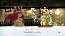 Rencontre : C'est au début du chapitre 6 que vous rencontrez le Bolmus dans la première maison au sol de la Ville des Bolmus. Quête : Vous devez exterminer tous les monstres dans le sous-sol du Bolmus. Vous pouvez y entrer en passant par le trou, à l'étage inférieur où il se trouve. Equipez-vous d'Oculis d'eau (saphirs) et utilisez les magies de Finn. Ouvrez la porte pour pouvoir visiter les lieux. A l'intérieur, allez tout à droite pour trouver un coffre hexagonal dans la roche. Il donne 3 Emeraudes brutes. Descendez et combattez la faucheuse de feu. Ouvrez le coffre dans le recoin à gauche, pour un Rubis poli. Passez les piques à droite, grâce au mécanisme blanc. Ouvrez le coffre juste en bas, pour faire sortir un ennemi, à abattre. Le coffre disparait, mais est comptabilisé dans les coffres à trouver sur la carte du monde. Un passage secret se trouve juste en dessous des piques. Entrez dedans pour mettre la main sur une Poudre d'étoile verte : Poudre de PV. A droite, vous avez une seconde faucheuse à vaincre. Poursuivez à droite et avant de descendre, regardez bien dans le coin supérieur droit. Dans la roche se trouve un coffre hexagonal renfermant 3 Potions de vie concentrées. Descendez pour voir deux rangées de piques, un mécanisme blanc, une porte fermée à droite et un levier. Utilisez le mécanisme blanc et le levier pour ouvrir la porte qu'un certain laps de temps. Passez la rangée de gauche des piques et descendez rapidement pour passer la seconde et franchir la porte avant qu'elle ne se ferme. Une fois de l'autre côté de la porte, faites quelques pas à droite. Ouvrez le coffre sur la butte juste au-dessus du chariot renversé. Un ennemi en sort à vaincre. Vous avez vaincu tous les ennemis. A présent, montez et évitez les piques. Ouvrez le coffre à droite du levier pour prendre un Rubis poli. Utilisez le levier et sortez du sous-sol. Parlez au Bolmus, et vous recevez deux Poudres de Magie. | ||||||||||||||