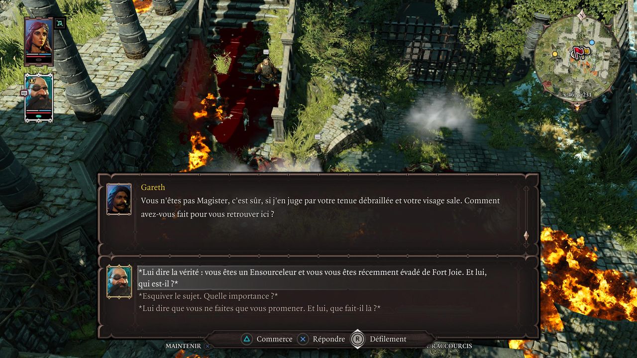 A la fin, Gareth vous remercie (+3000 XP) et vous dit de le retrouver au Sanctuaire d'Amadia. Avancez un peu pour débloquer le point de passage Marais Exsangues - Château en ruine. Vous obtenez +3000 XP pour avoir terminé la quête « Plus rien à perdre ». Retournez au Sanctuaire d'Amadia parler à Gareth, mais vous pouvez également parler à Leya qui se fera une joie de retirer vos colliers (vous pouvez aussi revenir avec les personnages restants dans votre équipe). Note : À l'intérieur de l'armurerie, vous trouverez ici une fontaine de Source, qui vous procure dès maintenant un approvisionnement infini en Source. Il vous suffit de revenir à chaque fois que votre personnage doit se recharger. Consultez la quête « L'armurerie » pour plus de détails.