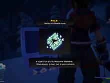 Dans La Montagne du Nord - Vallée de glace, avancez et prenez la voie en hauteur à droite. En haut, se trouve un coffre détenant une Potion + (16/25). Un peu plus loin, une cinématique se lance. Il faut trouver les différentes parties d'Olaf. Avancez tout droit sur le lac gelé face à la cascade gelée et Anna et Kristoff, vous voyez une brouette. Sautez pour monter et au bout, près de l'arbre, se tient un morceau de son corps. Juste à côté, prenez au passage un Reconcentreur (17/25) dans le coffre. Revenez à la brouette, et allez dans la zone à droite. Vous voyez une boule de neige derrière un arbre. Sautez dessus et écrasez-la contre un mur pour trouver la tête. Direction la cascade gelée, à présent, et au sommet repose une drôle de partie. Il manque un morceau. Prenez à droite en haut de la cascade et glissez doucement sur la pente. Sautez à droite dès que vous voyez un cristal. Sur cette corniche, il y a le torse. Au centre du lac glacé, la partie basse de son corps marche. Courrez après et chopez-les dès que la commande apparaît. Après le combat qui suit la scène, Sora dispose d'un nouvel emplacement d'accessoire et apprend la compétence Glissade aérienne. Avancez en prenant le chemin qui était derrière Anna, en fait face à la brouette (au sud-ouest sur la carte). Sur le chemin, faites un crochet dans l'impasse pour prendre un Ether + (18/25) dans le coffre. Poursuivez et dans la zone suivante, éliminez les ennemis. Montez via le chemin du côté ouest de la zone. Au bord de la falaise, vous voyez un coffre sur le rebord au loin. Utilisez le double-envol et une glissade aérienne (avec les compétences mises). Il détient un Ras du cou Glacier + (19/25). Poursuivez votre route. Ici, un framboisier se trouve sur le petit chemin à droite. Poursuivez ensuite, en sautant sur les petits pics. Tout en haut, vous affrontez des rondouillards casqués. Le combat ne se termine pas, car en fait, une Tendrombelle vous tire dessus, depuis un rebord en hauteur au sud. Montez sur le rocher en face pour l'abattre. Sautez de l'autre côté pour trouver un coffre renfermant un Booster PC (20/25). Suivez le chemin au nord-ouest. Ici, faites une glissade pour vous protéger derrière les gros rochers. Ensuite, il ne reste plus qu'à faire des tirs de couverture, pour vaincre les ennemis aisément. Dans La Montagne du Nord - Mur gelé, avancez tout droit. Au bout du chemin, récoltez des Champignons Portobello, derrière les petits arbustes enneigés. Avancez et utilisez les courants ascendants pour passer tous les obstacles. Au sommet, avant de poursuivre sur le chemin à votre droite, allez tout droit au bout de la falaise. Laissez-vous tomber en bas. Sur cette grande corniche, au bout, vous attend un coffre détenant un Mégaéther (21/25). Revenez au sommet avec la paroi. En haut, vous attend un combat contre des Sans-coeur, notamment avec un Dragon de givre. Ici, il y a une falaise à grimper et un vent ascendant. Utilisez ce dernier et suivez le parcours qui mène à une grotte où repose un coffre ayant une Amulette d'argent (22/25). Montez via la paroi juste à gauche. En haut, le chemin de gauche mène à la paroi délaissée tout à l'heure. Donc, poursuivez en face. Montez sur les boules de neige afin de combattre plus facilement les rondouillards sur le chemin. N'hésitez pas à toutes les utiliser et les grossir pour obtenir des Gemmes glaciales. Poursuivez pour voir un pan de mur permettant la course libre à l'horizontale. Montez tout en haut à droite, pour arriver sur un chemin étroit et enneigé. Au bout, ouvrez le coffre pour une Baguette magique + (23/25). En bas, des ennemis sont présents, dont des Dragons de givre. Suivez le chemin menant au château.