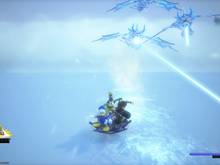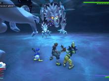 Après la scène, vous vous retrouvez dans Le Labyrinthe de glace - Palier intermédiaire. Comme à gauche, c'est une impasse, prenez l'autre chemin. Vous arrivez dans une zone avec des arbres et quelques ennemis à vaincre. Une fois la pièce vide, détruisez le mur de glace, pour ouvrir le passage. Un peu plus loin, juste avant les escaliers, cassez le mur de glace, pour trouver une salle avec un petit pont et des ennemis. Au fond du passage de la pièce, on peut voir un coffre inaccessible pour le moment, sur une corniche en hauteur. Revenez aux escaliers délaissés, et en haut deux chemins sont disponibles, des escaliers à gauches et une salle à droite. Allez dans cette dernière en premier, et tuez les ennemis. Grimpez sur le tas de rochers, à droite de l'entrée, pour récupérer une Cocarde des neiges (12/25) dans le coffre. Montez les escaliers à gauche dans cette pièce. Juste en haut du second, un mur de glace est à casser à gauche. Laissez-vous tomber dans ce passage secret, pour rejoindre le coffre sur la corniche inaccessible depuis une zone précédente. Il donne la Carte du Labyrinthe de glace (10/25). Remontez via le mur et poursuivez votre chemin. Dans cette salle un combat contre de nouveaux Simili débute. Après, sautez vers le pilier de glace et appuyez sur Carré pour faire une glissade aérienne vers lui (avec la compétence Rotation activée). La pièce a bougé, donnant accès à un nouveau passage. Descendez la pente tout en évitant les glaçons et en tuant les ennemis. Au bout, laissez-vous tomber dans une nouvelle zone. Dans Le Labyrinthe de glace - Palier inférieur, avancez dans la grande pièce pour un combat contre des Simili. À la fin du combat, Sora apprend la magie Foudre +. Un point de sauvegarde et une Boutique Mog sont présents. Activez les deux piliers avec une attaque tournante sur eux. Allez dans la petite salle au nord-est pour mettre la main sur le jeu du Royaume Classique : Olympiades rustiques (14/25) dans le coffre. À présent, allez à l'ouest et utilisez le Tir visé et Agilité pour rejoindre le haut du mur. Vous revoilà dans Le Labyrinthe de glace - Palier intermédiaire. Avancez pour tomber sur des ninjas. Après la bataille, Dingo apprend la compétence Soin amical. Pensez à casser les objets du décor, notamment les cristaux de glace qui peuvent donner une Pierre de mithril. Activez une fois le pilier, puis prenez le passage juste à côté. Glissez sur le rail et au bout dans la salle, il faut venir à bout d'autres Simili. Une fois vaincus, Dingo a un nouvel emplacement d'objet et Sora apprend la compétence Esquive hasardeuse. Vous avez sans doute remarqué au bout du rail, qu'un autre était visible sur la carte. Revenez sur le rail, et cassez les pics de cristaux gênants sur le rail en hauteur. Arrivé au début du rail, remontez dessus, et cette fois-ci à mi-parcours, sautez pour monter sur celui au-dessus. Au bout, il vous mène à un coffre qui renferme un Attache glacier (15/25). Descendez et revenez dans la salle précédente. Il est temps d'actionner le pilier, qui est une sorte d'ascenseur. Dans Le Labyrinthe de glace - Palier supérieur, trois chemins sont disponibles. Au nord-ouest, il y a juste un emblème fétiche. Au nord-est, ce sont juste des Tendrombelles qui sont présentes. Prenez le chemin au sud. Les deux coffres donnent une Chevillère noire (11/25) et un Acier Damas (13/25). Examinez la boule pour sortir de ces lieux.
