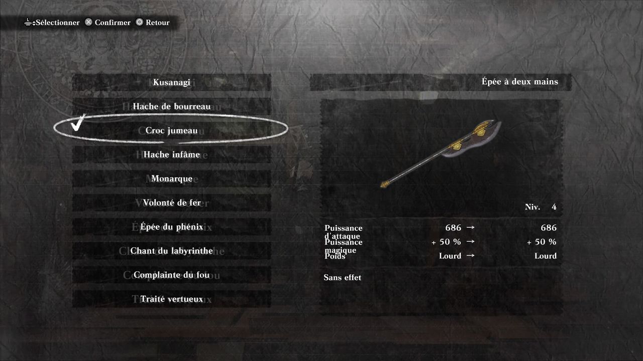 Voici la liste de toutes les épées à deux mains, avec le lieu d'obtention (il est indiqué le chapitre du cheminement ou le nom de la quête pour plus de facilité) ainsi que leurs noms (par rapport à Nier, certains noms ont changé). Sachez que seuls les noms peuvent varier d'une version de jeu à l'autre, les effets et matériaux sont presque les mêmes. Voici une liste des différences. Pour l'Epée de phénix (Glaive du phénix), il ne faut plus qu'un Oeuf d'aigle au niveau 2 au lieu de 2. De nouvelles armes font leur apparition avec le Mondes des Vaisseaux Vacants, et quatre sont offertes avec le DLC gratuit Yohra. Du coup, voici leurs tableaux descriptifs :