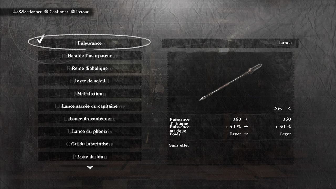 Voici la liste de toutes les lances, avec le lieu d'obtention (il est indiqué le chapitre du cheminement ou le nom de la quête pour plus de facilité) ainsi que leurs noms (par rapport à Nier, certains noms ont changé). Sachez que seuls les noms peuvent varier d'une version de jeu à l'autre, les effets et matériaux sont presque les mêmes. Voici une liste des différences. De nouvelles armes font leur apparition avec le Mondes des Vaisseaux Vacants, et quatre sont offertes avec le DLC gratuit Yohra. Du coup, voici leurs tableaux descriptifs :