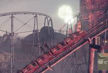 Après avoir écouté votre Commandant, suivez ses instructions. Sortez du Camp de la Résistance, et parcourez le chemin jusqu’au prochain point sur votre carte, menant à une échelle pour descendre dans les égouts. Prenez la première vue au bout des égouts pour rejoindre votre destination. Vous êtes dans le Parc d’attractions, plus exactement à la place principale. Les machines sont inoffensives et elles donnent même des objets. Parlez notamment au grand frère mécanique près d’un arbre au sud. Il vous remet une Boucle d’oreille. Vous pouvez les combattre après, pour avoir leurs données et aussi un trophée (si ce n'est pas encore fait). Montez les marches et vous recevez un message à lire dans un point d’accès. En haut des premières marches, parlez à la soeur ballon pour obtenir un Bracelet terni. Entrez par le portique ouvert à droite, et au bout vous voyez une fleur étrange. Il y a aussi un magasin vendant des matériaux. Ensuite, passez dans le couloir face au magasin. Vous pouvez après la scène interagir avec le point d’accès du parc : place des manèges. Le coffre verrouillé au sud-est, derrière le manège, renferme une archive : Prospectus déchiré. Ensuite, sautez sur les petits vaisseaux un par un jusqu’à atteindre l’autre côté. Descendez et la machine clown vous avertit d’un danger derrière lui. Montez l’escalier à sa gauche. Vous tombez ensuite sur une espèce de tank. Vous pouvez affronter maintenant ce char du parc. Attention, dès que vous le frappez, il attaquera lui aussi. Montez dessus et achevez les petits robots afin de ne pas recevoir trop de dégâts de toute part. Il laisse derrière lui un Noyau machine. Ensuite, un autre coffre verrouillé repose dans le coin nord-est, derrière l’arbre près des escaliers, détenant une archive : Ticket de loterie sale. Montez les marches à côté pour atteindre le wagon des montagnes russes. Montez dedans et attaquez les ennemis en hauteur grâce à votre pod. Une fois le trajet fini, sautez dans le trou pour affronter le boss.