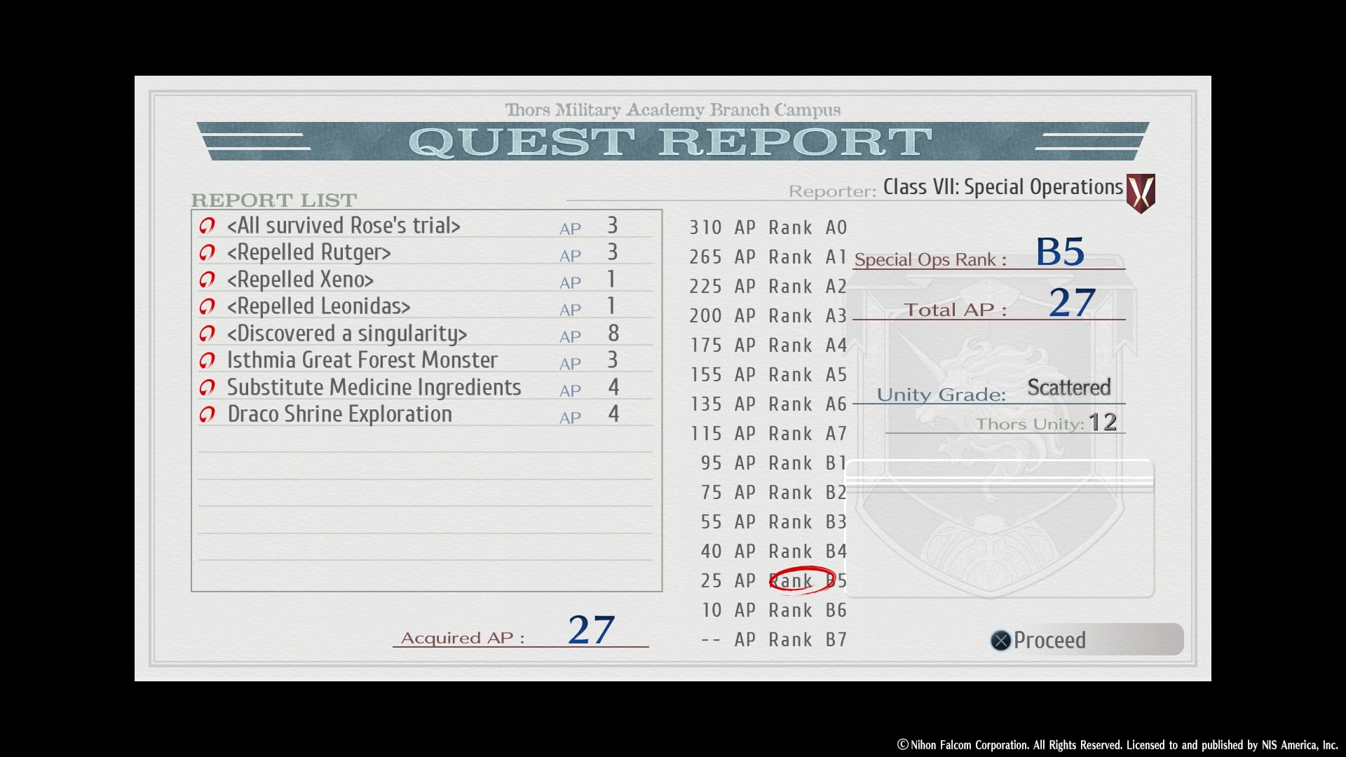 - Durant le premier combat, essayez de finir avec 4-7 PB et au moins 100 CP (voire 200) pour tous les personnages. - Dans le second combat, si vous venez à bout des ennemis en moins de 35 tours, vous gagnez 5 AP. Lancez l’ordre Proud Warrior ou Crazy Hunt, lancez tous vos S-Craft, puis vos meilleures magies ou coup. Prenez le personnage en attente pour lancer aussi le sien vers la fin au besoin. Après ces batailles, la journée se termine et vous recevez votre Quest Report : Special Ops Rank : B5, Total AP : 27, Unity Grade : Scattered, Thors Unity : 12. Vous obtenez Shining Star Crest et Invigorate.