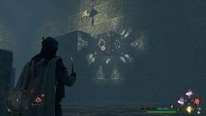 Dans la salle, avancez jusqu'aux deux cubes au centre de la pièce. Passez derrière eux et lancez Repulso sur celui en bas pour le lancer vers le mur à l'ouest. Faites de même avec celui du haut. Rejoignez-les et mettez-vous légèrement au nord (donc du côté droit en étant face à eux) et poussez-les vers le sud avec Repulso. Restez sur le côté droit, et visez la face du cube en bas pour lui lancer Accio l'amenant contre le mur à l'est. Montez sur votre pile de cubes et sautez sur celui en face près de la lampe murale à l'est pour atteindre le premier coffre. Depuis cette hauteur, vous voyez les deux autres coffres au nivau des deux autres lampes.