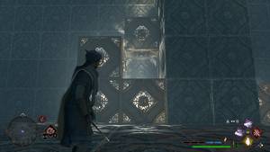 Descendez et lancez Repulso sur le double bloc vertical à l'est, pour qu'il parte vers le sud. Grimpez sur les quatres blocs et regardez vers le sud-ouest pour voir un ensemble de blocs formant un H. Visez une des deux faces pointant vers le nord et lancez Accio pour que le H aille dans cette direction. Montez dessus et regardez au sud-est pour trouver trois blocs impilés à la verticale. Visez une des faces en direction de l'ouest et lancez Accio dessus, Courrez et sautez dessus pour atteindre le deuxième coffre. Faites demi-tour et sautez sur le H. Regardez vers le sud-ouest, le bloc de trois cubes à la verticale, et lancez Repulso sur une face au nord pour le propulser vers le sud. Faites demi-tour et sautez à l'est sur le cube central vissé au sol. Regardez au sud-est les trois cubes à l'horizontal (c'est un L caché) plaqué contre le mur est. Visez la face en direction du nord et lancez Accio pour mener le L vers le nord. Lancez Accio pour le mener à l'ouest. Descendez du côté ouest afin de pousser avec Repulso les quatre blocs au sol à l'horizontal vers le mur à l'est. Approchez de la face au nord et lancez Repulso dessus pour que le bloc parte au sud. Montez sur le H à l'ouest er regardez la pile de trois cubes à la verticale au sud-ouest. Visez une des faces en direction de l'est et lancez Accio pour qu'ils y aillent. Visez une des deux faces en direction de l'ouest du bloc en L vers le sud et lancez Repulso pour l'envoyer contre le mur à l'est pour qu'il se colle aux autres blocs. Ramenez l'assemblage de tous ces blocs avec Accio vers l'ouest. Positionnez-vous à la pointe sud-est du H. Visez la face centrale en bas pointant au sud pour lancer Accio qui vous amène au sud. Sautez à l'est sur les blcs en L et grimpez pour rejoindre la porte au sud où repose un Coffre de collection.