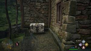 Allée de la Tête de Sanglier : le miroir se trouve derrière le mur de la maison au sud-ouest de l'auberge, à côté d'un coffre-oeil. Le papillon est posé sur une caisse contre le mur à droite de l'auberge |