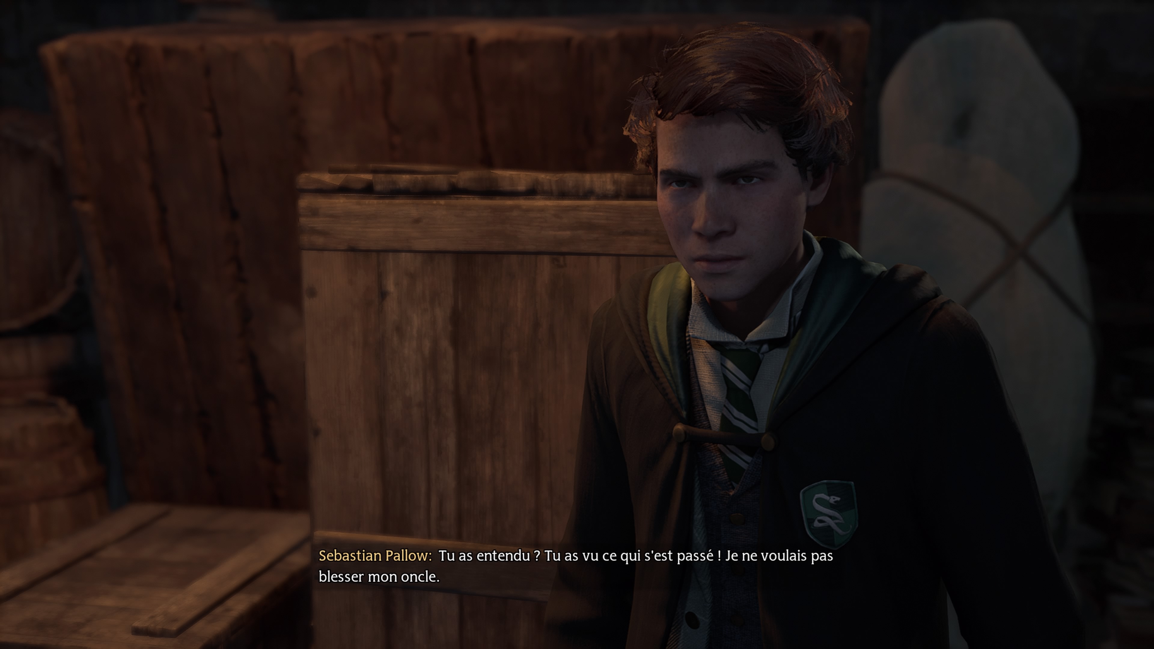 Il faut parfois faire passer des jours (depuis le menu de la carte, attendez avec R3 pour avancer le temps) pour que les quêtes apparaissent. S1. Dans l’ombre de la ligneAprès avoir terminé la quête principale « Dans l’ombre du domaine » au chapitre 7, rendez-vous dans la Grande Salle (Poudlard) pour trouver Sebastian. Discutez avec lui pour clore cette mission plutôt succinte. S2. Dans l’ombre de l’étudeAu chapitre 7, après avoir fini les quêtes principales « Cours d’astronomie » et « Le Haut donjon », et la première quête de relation de Sebastian, vous recevez un Hibou express de ce dernier. Avec un niveau 16 recommandé, rejoignez-le à la Salle commune de Serpentard (Grand escalier) au niveau de la flamme de cheminette Partie basse du grand escalier. Après les dialogues, suivez-le pour pouvoir parler à Ominis. Il y a trois braseros et ils doivent être allumés en même temps. Allumez-les rapidement avec Incendio ou Confringo avant qu’un s’éteigne. Cela ouvre un passage secret, menant au scriptarium de Serpentard. Ramassez le message de Noctua Gaunt 01 sur 05 et lancez Reparo sur les débris pour former une sculpture. Parlez à Ominis qui vous ouvre la porte suivante. Juste derrière, à droite se trouve une porte fermée avec deux symboles en son centre. Approchez de la serrure de Serpentard à côté, et dans le temps imparti d’un tour du serpent, il faut associer les deux symboles. Au bout du parcours, vous avez une torche à allumer, le message de Noctua Gaunt 03 sur 05 et une serrure de Serpentard, mais pas le code. Revenez au début et partez à gauche. Vous avez une pièce avec une grille à moitié fermée à gauche et une porte fermée avec symboles à droite. Gardez en mémoire les deux symboles, et accroupissez-vous pour entrer dans la pièce de gauche. À l’intérieur, allumez la torche, récupérez le message de Noctua Gaunt 02 sur 05 et une serrure de Serpentard, où il faut mettre les deux symboles de la porte précédente. Passez la porte ouverte, prenez message de Noctua Gaunt 04 sur 05 juste devant et dans la salle à gauche, vous avez un coffre. Mémorisez les symboles de la porte à droite et il faut aller à la serrure de Serpentard, qui était derrière la première porte, qu’on a laissé de côté au début. Il est temps de passer la porte ouverte et se retrouver devant la grande porte du scriptarium de Serpentard. Ramassez le message de Noctua Gaunt 05 sur 05. Après, discutez avec Sebastian, puis avec Ominis et enfin à nouveau avec Sebastian. Un choix vous est proposé, où il vous propose d’apprendre le sortilège Endoloris. Comme cela n’a aucune conséquence d’apprendre les sorts impardonnables, et vu leurs puissances, il serait dommage de passer à côté de ce sort, mais le choix vous est accordé. Ensuite, à vous de choisir qui en sera victime. Entrez dans le Scriptorium, où il y a une page de Revelio Scriptorium de Salazar Serpentard, deux coffres, un extrait de Serpentard et le livre de sorts de Serpentard. Donnez le livre à Sebastian et sortez du cachot. Écoutez la conversation pour clore la mission et recevoir 180 EXP. S3. Dans l’ombre de la découverteAu chapitre 8, après avoir terminé la quête principale « Épreuve de Charles Rookwood » du chapitre 7 et les deux quêtes de relation précédentes de Sebastian, vous recevez un hibou avec lequel il mentionne sa position, à savoir dans la Crypte (L’aile d’astronomie). Discutez avec lui et Ominis pour faire le point et cela termine cette mission succincte. S4. Dans l’ombre du tempsAu chapitre 8, après avoir terminé la quête principale « Devoir du professeur Weasley » et les trois quêtes de relation de Sebastian, avec un niveau 17 recommandé, il faut le rejoindre aux Catacombes de Feldcroft (Région de Feldcroft). Une fois à l’intérieur, dans la première salle, venez à bout des araignées. Brûlez les toiles d’araignées. Prenez la caisse et mettez-la sous le rebord au nord-ouest pour atteindre un coffre de collection. Avancez jusqu’à une deuxième salle ronde, infestée d’araignées venimeuses. Propulsez les portes au sud-ouest avec Repulso pour trouver deux coffres au fond de la galerie. Revenez à la salle précédente et partez vers l’est. Vous voilà dans une grande pièce avec des os posés sur un sarcophage au centre. Ramassez l’extrait d’un journal d’élève au pied du sarcophage et parlez-en à votre compagnon. Il faut trouver un moyen de franchir la barricade. En fait, il faut transporter les tas d’os, un sur le sarcophage, un derrière un anneau à tirer à l’ouest de ce dernier, un autre derrière un anneau derrière le mur à péter à droite de la barricade. Partons explorer en pétant le mur au nord et rampez dans le trou. Grimpez la pente pour trouver une fosse avec du Fil du Diable. Lancez Lumos pour descendre. Mettez le feu aux deux braseros pour faire partir les lianes. Tirez les anneaux sur les côtés pour faire tomber des os. Au sol, prenez les tas d’os avec Wingardium Leviosa et mettez-les sur les piquets en hauteur à l’entrée du trou. En mettant les deux tas d’os, cela forme un pont. Poussez les portes avec Repulso et suivez le chemin pour rejoindre un coffre et un coffre de collection derrière les grandes barres. Ouvrez le passage avec l’anneau pour revenir dans la salle du sarcophage. Passez la porte à présent ouverte et vous avez le choix d’apprendre le sort Impero. C’est un sort impardonnable, mais comme cela n’affecte en rien le jeu, et qu’ils sont puissants, apprenez-le. Ici, vous avez plusieurs chemins disponibles. En allant au nord, vous faites face à un groupe d’araignées qui gardent juste un coffre légendaire. Revenez dans la salle d’avant et partez au sud en poussant la double porte. Il faut à nouveau s’occuper d’une barricade. Il y a des portes avec deux symboles dessinés dessus. C’est l’ordre qu’il faut tirer les anneaux avec le symbo