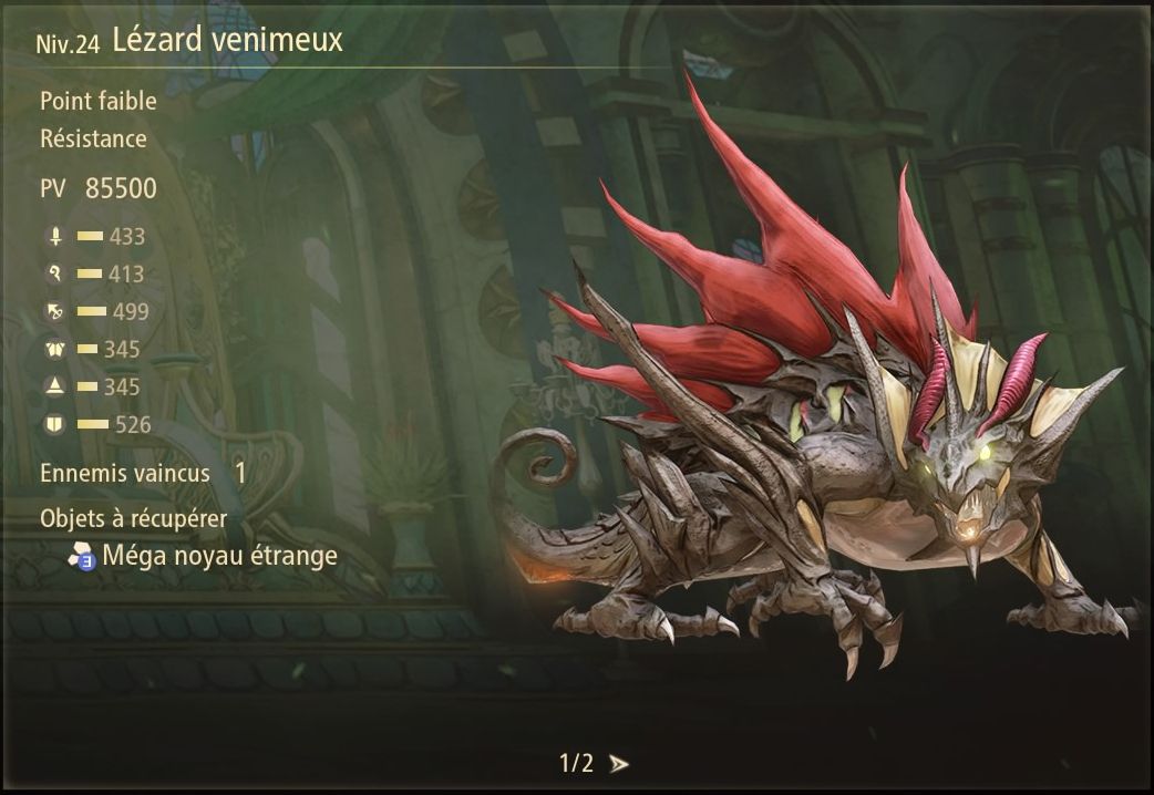 Ennemis : granilem, bestiole, masse terreuse Kisara rejoint le groupe (tutoriel sur son point fort et saynète). Dans le site minier 2, avancez pour une scène (puis saynète). Descendez et vous faites face à deux granilems, qui font office de tutoriel à l’attaque bonus de Kisara. Après la bataille, Kisara obtient le titre : Mur indestructible. Descendez l’échelle puis fouillez le baluchon à gauche pour une gelée de pêche et extraire des morceaux de cuivre à gauche. Face au mur de fumée toxique, utilisez l’action de terrain de Kisara, à savoir purification. À droite, vous pouvez extraire des cristaux de légèreté et au nord ouvrez le petit coffre pour du poulet. Montez les escaliers et prenez un bloc d’opale dans le coin sud-est. Au croisement, purifier le nuage de fumée toxique et prenez un opale dans le coffre en hauteur. Descendez les escaliers délaissés, puis ne montez pas à l’échelle au nord-ouest. Direction le sud pour tomber sur un coffre renfermant 2400 Gald. Grimpez à l’échelle au nord-ouest pour atteindre un coffre donnant une fiole de résurrection. Poursuivez à l’est tout en prenant une gelée de pêche dans un baluchon sur le chemin et un cristal de légèreté, du brimore (extractions). Montez à l’échelle au sud-est pour récupérer une camomille. Purifier le nuage de fumée toxique à l’est au centre pour mettre la main sur un puissant remède dans le coffre. Montez l’escalier et purifiez le nuage de fumée toxique tout à l’est pour atteindre le coffre détenant une cotte de topaze. Au nord, suivez les grilles et laissez-vous tomber. Prenez une gelée d’orange dans le baluchon et n’oubliez pas les points d’extraction pour des blocs d’opale. Grimpez les escaliers centraux pour une scène. Utilisez le halo de soins avant d’aller combattre le boss.