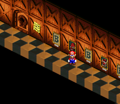 La porte menant au balcon est verrouillée, il vous faut un mot de passe pour l'ouvrir. Pendant que Mario réfléchit à un moyen d'ouvrir la porte Booster fait son apparition dans la salle, notre héros aura quand même eu le temps de se cacher derrière les rideaux.
