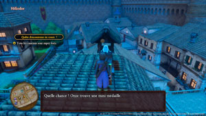 Explorons à présente la partie est de la ville. L’auberge, en premier lieu, comporte une Herbe médicinale sur le balcon, du Fil de lin dans une chambre, et un Foulard dans l’autre. Dans les tonneaux près du linge se trouve une Aile de chimère. Près du marchand de tableau, cassez les jarres pour avoir 6 pièces d’or. Dans la maison du marchand d’objets, vous pourrez trouver une nouvelle Herbe médicinale, une Aile de chimère, et 6 pièces d’or sur le toit. Profitez d’être sur le toit pour aller chercher le coffre qui contient une Mini médaille, votre toute première (image). Redescendez et escaladez le balcon de la maison suivante pour trouver une Plume de vent dans une jarre. Tout à l’est de la ville, vous verrez deux tonneaux sur une plateforme : l’un d’eux contient 30 pièces d’or. Fouillez aussi la petite maison située tout à l’est pour y trouver du Silex, 9 pièces d’or, et une Herbe médicinale. Un peu plus au nord, un garde semble vous boucher le passage, mais vous pouvez le contourner en sautant sur caisses et ainsi trouver une Graine de Force, et du Silex. Dans le jardin de la maison derrière l’église vous trouverez une Herbe curative, ainsi que des Bas résille dans l’armoir à l’intérieur. Longez également le mur de gauche de l’église afin de trouver 4 pièces d’or dans un tonneau. Enfin, tout à l’est, sous les alcôves, trois tonneaux vous attendent : Herbe médicinale et 7 pièces d’or.