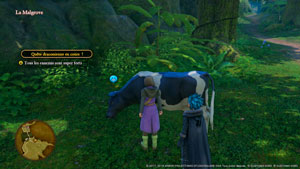 Vous arrivez directement aux Chutes de Caubaltin où vous pourrez trouver de l’Eau fraîche. Inspectez le rocher à trois faces situés près des chutes. Vous y trouverez plusieurs lettres ainsi qu’un objet de valeur : la Clef de pierre, Lettre d’adieu de la reine, Lettre de Chalco. Vous pouvez à présent explorer la zone. Ainsi, vous trouverez de nombreux points lumineux au nord : Rameau rose, Aile de papillon, Herbe curative x2. Vous verrez également une nouvelle vache météorologue dans les environs (image), de même qu’un coffre situé au-dessus d’un petit rocher qui contient une Peau résistante. De l’autre côté du feu de camp, vous trouverez quatre nouveaux points lumineux : Fleur de coton x2, Liseronfle, Pimenboise, Plume de vent, Sève étincelante, Mystige marine x2. Au bout du ponton, brisez la jarre dans la cabane pour obtenir 13 pièces d’or. Le chemin vers la porte étant inaccessible, sauvegardez, reposez-vous et entrez dans le Tertre du roi.