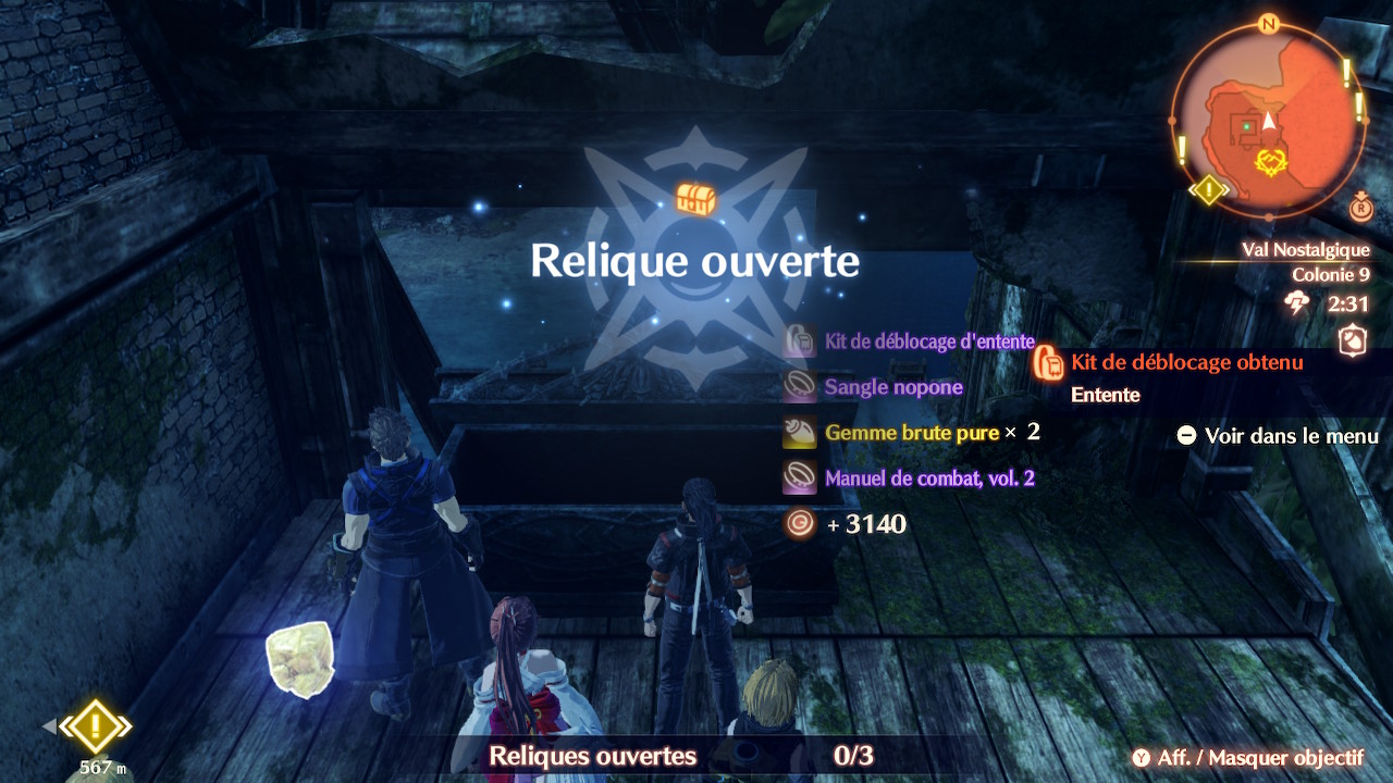 Conteneurs : Val Nostalgique Relique : Val Nostalgique (Colonie 9), Gorges d'Aurora - Ruines de la tombe du roi Agni Quêtes : L'atelier de Riku, Entraînement de Panacea MU : MacBright le cavalier, Giuseppe le censeur, Umir le troglodyte, Brannigan le lutteur |