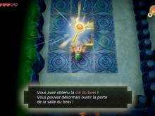 Dans la zone en 2D, avancez et plongez dans l’eau à gauche pour récupérer la petite clé qui était tombée dans le trou. Retournez dans la salle précédente, et poussez le bloc vers le bas. Descendez dans la salle suivante, et plongez à gauche pour rejoindre le coffre qui était inaccessible, pour prendre 50 rubis. Revenez au nord puis à l’ouest pour être dans la pièce juste avant celle du mini-boss. Allez dans la salle en bas pour nager jusqu’au coffre qui détient aussi 50 rubis. Revenez à la salle du haut et cette fois-ci, plongez à gauche. Dans cette salle, poussez le bloc à gauche pour poursuivre dans cette direction. Vous voilà dans la pièce avec les dalles à allumer dans le même ordre que le précédent. Si jamais vous ne vous en souvenez plus, sachez que la dalle s’illumine en bleu quand c’est la bonne, et devient rouge si c’est la mauvaise et il faut recommencer. Descendez les escaliers qui sont apparus dans le coin nord-est. Dans cette zone en 2D, courez avec les bottes de Pégase pour éviter de vous faire écraser par les blocs qui tombent. Au bout, faites tomber la pierre en vous approchant d’elle un peu, et grimpez vite sur l’échelle afin de sauter sur elle pour atteindre la sortie à gauche. Une fois dans la salle suivante, allez au sud pour trouver le coffre détenant la clé du boss. Revenez au nord et laissez-vous tomber en bas. Sortez par le sud-est. Dans la salle du hibou, nagez au nord-ouest pour rejoindre une porte fermée. Marchez sur le socle au sol à droite pour l’ouvrir. Récupérez les trois coeurs en l’air avant d’utiliser une petite clé sur le bloc à serrure.