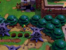 Retournez à la maison aux coquillages, descendez et allez à gauche. Montez au nord pour trouver les portes du château Canulet. Elles sont fermées. Longez à droite pour trouver au bout du chemin, Kiki le singe. C’est la suite des échanges, donnez-lui les bananes pour voir un pont se construire. Vous ramassez un bâton que les singes ont laissé tombé. Traversez le pont pour entrer dans le château Canulet. Allez tout au nord et coupez le buisson pour dévoiler un escalier. Empruntez-le pour une phase 2D. Une fois traversée, vous voilà dans la cour. Allez à droite, et vous voyez 5 trous au sol. Un chevalier lance des bombes depuis un des trous. Quand il sort sa tête, laissez-le préparer son lancer, et foncez sur lui quand il la lance pour lui faire des dégâts. Une fois vaincu après quatre coups, il lâche une feuille d’or. Allez à gauche pour voir un corbeau dans un arbre. Prenez un rocher et lancez-le sur lui pour le faire descendre de son perchoir. Attaquez-le quand il fonce sur vous. Il laisse tomber une seconde feuille d’or.